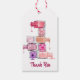 Fun gift tag features stacked bottles of nail polish in a variety of colors with customizable pink text. Perfect for salon giveaways and spa parties.