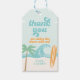 Etiquetas de agradecimento de 1º aniversário da The Big One Praia de Surf com ondas turquesa e prancha de surf laranja.