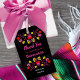 Festa mexicana bonito temia obrigado que etiquetas para a sua Quinceanera (editável para qualquer ocasião). As etiquetas têm um design floral de arte popular colorido sobre fundo preto. O texto diz "Obrigado por comemorar a minha Quinceañera" e a modelo está pronta para você editar seu nome e ocasião. Por favor, procure na minha loja a coordenação de Convites e Favoritos para festas.