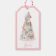Este design de etiqueta de presente apresenta um castelo de biscoito de gengibre pastel tradicional feito com 4 camadas de casas de biscoito. Você pode personalizar com seu nome. As cores incluem rosas claro, azul-claro e verde-claro e bronzeado sobre um fundo branco brilhante. O dorso tem um padrão de floco de neve rosa e branco.