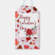 Esta elegante etiqueta branca de presente apresenta um tema de Dia de os namorados bonito. A etiqueta é adornada com corações vermelhos e uma rosa vermelha, e o texto "Feliz dia de os namorados" é escrito em caracteres cursivos vermelhos. Perfeito por adicionar um toque romântico ao seu presente especial.