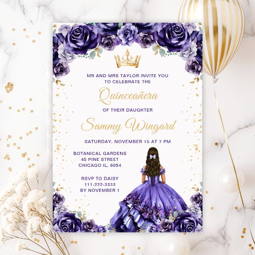 Esta elegante e glamourosa etiqueta de presente de aniversário pode ser personalizada com um nome. O design apresenta uma bela princesa com cabelo escuro em um vestido de bola roxa escura. O texto combina o script manuscrito e as fontes sans serif modernas para um aspecto elegante e sofisticado. Os arranjos florais e o confete de ouro criam a mistura perfeita de rústicos e quicos. Isto é perfeito para dar presentes e favoritos para festas. Gráficos por www.etsy.com/uk/shop/SunflowerDayLove