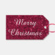 Uma etiqueta de Natal brilhante, vermelha e falsa, com texto personalizável que diz: "Feliz Natal". A parte de trás da etiqueta é branca para facilitar a escrita e a leitura de nomes para o seu presente.
