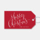 As etiquetas de presentes de Natal personalizadas apresentam uma grande caligrafia manuscrita guião de Feliz Natal e nome de família personalizado em vermelho e branco, simples, moderno e elegante.