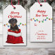 Na frente desta etiqueta de presente de Natal está uma imagem de um cachorrinho giro em uma bolsa de presente de Natal vermelha e branca. Atrás do cachorro há uma série de luzes coloridas de Feriado. O texto no topo diz "Feliz Natal". A parte traseira da etiqueta repete a imagem das luzes Feriados, com campos de texto em vermelho para que você personalize.