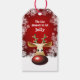 Rudolph, a rena vermelha do nariz e a etiqueta de presente de Natal com flocos de neve.