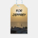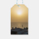 Vista através do complexo de bungalow até o mar com um barco à vela ao pôr do sol, em Costa Adeje, Espanha, Tenerife