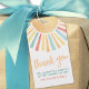 Etiquetas de agradecimento Boho Sunshine Sun. Esta etiqueta de agradecimento é uma forma alegre e vibrante de expressar gratidão, apresentando um sol brilhante no topo com "Obrigado" em escrita fluida abaixo. Uma pequena nota de agradecimento, junto com o nome da família, completa o design, tornando-o pessoal e sincero. A parte de trás da etiqueta também exibe o sol, adicionando um toque extra de calor e cor. Esta etiqueta é perfeita para uma festa de 1º aniversário "Primeira Viagem ao Redor do Sol" ou até mesmo para um chá de bebê "Aqui Vem o Filho". Seu tema divertido e colorido com tons de amarelo, laranja e azul-turquesa torna-o ideal para qualquer celebração cheia de sol.