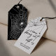 Use etiquetas de presentes personalizadas para sua festa de Halloween. A design apresenta o texto "venha sair conosco" em uma fonte com letra manuscrita com teias de aranha como uma borda.