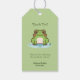 Uma etiqueta verde de presente com uma ilustração de um sapo fofo no seu lago e textos personalizáveis em cores verdes escuras! Pode ser perfeito obrigado seu convidado para vir a um aniversário, uma festa de inauguração, um casamento, aposentadoria, festa de solteira, etc.