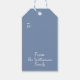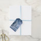 The tag's background features muted blue and silver tones, accented with hints of subtle lavender and peach in the sky, reflecting an early morning or late afternoon glow. Elegant script proclaims 'Season's Greetings,' which can be changed to any phrase to match your occasion, adding a classic touch, and you can personalized the front and back. Ready to tie onto your special gifts, holiday party favors, or Christmas gift wrapping.