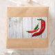 Fronteira do canto dos pimentos de pimenta-do-sul, vermelhos e verdes, crescidos de forma orgânica sobre fundo branco de madeira lavado