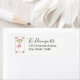 Etiquetas de endereço com um flamingo cor-de-rosa rico com uma perna erguida. Vestindo um chapéu de santa rosa e um pouco de holly sazonal. Holly com bagas também enfeita os cantos. Um buquê floral com canetas doces acima da cabeça.