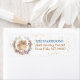 O lado esquerdo destas etiquetas de endereço de retorno apresenta uma imagem de uma coroa de primavera em cores de rosa mole, azul, dourado, verde e creme. No centro está um retrato de aquarela de um cachorro da Pomerânia. Pequeno confete de ouro dá um brilho sutil ao fundo. Seu texto personalizado está em ouro azul e marrom à direita.