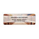 Etiquetas de endereço com uma fotografia cênica. Uma ponte de madeira em direção a um caminho rodeado por árvores florestais mudando de cor.
