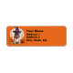 Um cachorrinho bonito vestindo um chapéu de bruxa e uma bandana do crânio, sentada em uma vassoura, é flanqueado por abóbora esculpida ou lanternas. Etiqueta bonita para seus cartões de Dia das Bruxas.