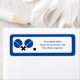 Rackets de pingue-pongue de tênis de mesa de mesa e etiqueta azul escura e esferográfica que contém um ícone de pictograma minimalista de raquetes de tênis azul e preto e bola e o seu texto sobre fundo branco com borda azul.