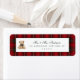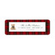 Red plaid patterned Christmas return address label design with a cute teddy bear illustration.