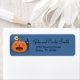 Adorável riso de abóbora de Halloween. Uma árvore morto, uma mansão assustadora, alguns morcegos, e a lua são vistos no fundo.