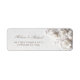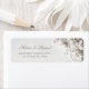 Estas etiquetas de casamento apresentam flores de rosas brancas 3D em um fundo branco.
