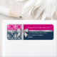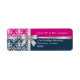 © 2021 Designs socialitas. Etiqueta de endereço de retorno de casamento elegante modelo para um casamento de verão que incorpora damasco branco, uma fita e arco prateada impressa e duas cores de fundo de fúcsia e azul marinho. Entre em contato com Designs socialitas se você quiser uma combinação de cores diferente, ajuda na personalização ou outros produtos de casamento criados com este design. POR FAVOR, OBSERVE QUE A FAIXA É UM DESIGN IMPRESSO NO CONVITE.