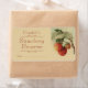 Ilustração de morangos com folhas verdes, sobre fundo bege com texto colorido russet, a partir de pintura de vintage de Catharina ou Catherine Klein, nascer 1861. O rótulo é criado para enlatar ou engarrafar casas de doces, geleias e conservas. Você pode deixar o espaço de data para escrever ou mudar para a data em que seu emperramento ou gelatina foi feito.