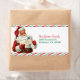 Esta etiqueta de endereço de retorno apresenta uma imagem de vintage de um Papai noel clássico com um pacote de presente. A imagem é bordada por cima e por baixo, com um bonito padrão vermelho, verde e branco de distribuição de cana doce. Seu texto personalizado está vermelho e verde no lado direito.