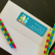 As pranchetas retornam etiquetas de endereço com modelos de texto personalizados. Adicione texto em três ou quatro linhas impressas sobre cor azul lacrimogênea. Três pranchas decoradas sentam-se na areia da praia, na borda esquerda das etiquetas magras.
