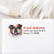 Aqui está uma etiqueta de endereço de retorno para o dono do Bulldog. À esquerda está um retrato de um buldogue marrom e branco vestindo óculos escuros. Seu texto personalizado está em vermelho e preto à direita.