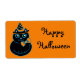 Essas etiquetas de feriado contêm um gato preto estilo retrô desejando a todos um Feliz Dia das Bruxas. O design é da arte original.