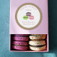 Um adesivo Rótulo rústico com comitiva kraft castanha, uma ilustração de 3 macarões franceses coloridos em cores rosa, roxa e verde e textos personalizáveis. Você poderia usá-los quando oferecesse doces ou para vender suas receitas de pastelaria.