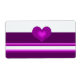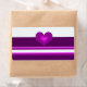 Uma etiqueta elegante com um design de listras roxas vibrantes sobre fundo branco. Um coração roxo sombreado no centro.