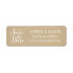 As etiquetas de endereço de retorno de casamento contêm "Salvar a Data" em um script branco e um fundo com uma aparência texturizada de papel kraft castanho rústico.