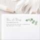 Manuscrito Eucalyptus, Sr. Endereço do Nome da Sra. Return. O Sr. e a Sra. estão em um estilo moderno de escrita manual e seu nome e endereço estão abaixo e alinhados à direita. Um ramo de verde e uma dica de ouro, o eucalipto, saem do lado direito.