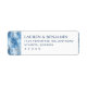 This return address label features a minimalist yet elegant design with a frosty, wintery theme. The left side showcases stylized tree branches in varying shades of blue and white, creating a serene winter effect, while the right side provides clean white space for text. The color palette includes cool tones of light to medium blue accented by darker blues, enhancing the seasonal touch. The classic serif font adds a refined appearance, centered neatly on the label for balanced readability. Perfect for formal occasions, this design evokes a sense of calm sophistication, ideal for those looking to add a touch of winter elegance to their correspondence.