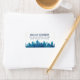 Etiquetas de endereço modernas e em negrito, com uma linha de horizonte de cidade pintada a cores-d'água em azul-marinho e lacre.
