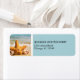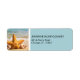 Etiquetas de endereço com uma fotografia fofa de um peixe-estrela posicionado na vertical na areia. Debaixo dos braços estão 2 conchas descansando confortavelmente. Colocada em uma praia com ondas caindo ao fundo.