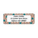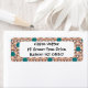 Estas etiquetas de endereço de retorno têm um design geométrico de triângulos castanhos e bronzeados repetidos com círculos de turquesa em cima num campo de esbranquiçado.