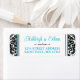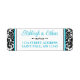 Essas etiquetas de endereço de retorno de casamento de cor damasco branca e preta têm uma cor damasco nos lados esquerdo e direito com a área de texto em branco com bordas azuis pretas e turquesas no centro que correspondem ao convite de casamento definido abaixo. O(s) seu(s) nome(s) e endereço(s) de devolução estão em azul-turquesa com um divisor de rolagem preto-ornamentado entre eles.