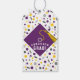 Etiquetas de presente de congratulações de formatura criativas e lembranças de festa de graduação, apresentando um boné roxo com uma borla dourada em fundo de confete. Edite o texto para adicionar o nome do graduado e o ano da turma de formandos.
