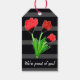 Stripes em preto com a arte da flor da tulipa vermelha. O texto pode ser personalizado para qualquer ocasião. O texto também é removível. O fundo vermelho e/ou cinza pode ser alterado para sua cor favorita ou alterado para branco. A imagem da flor pode ser alterada para sua foto favorita. Personalização de opções em frente e atrás.