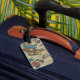Os minúsculos ícones de viagem são fixados por etiquetas elegantes, feitas de creme claro ou acrílico azul claro. Essas etiquetas adicionam um toque de sofisticação, sua superfície lisa contrastando com o mapa vibrante e os ícones lúdicos. Cada etiqueta pode variar ligeiramente em forma, ecoando os continentes que representa.