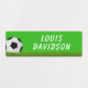 Etiquetas personalizadas de futebol com tema infantil, com fundo verde, grama, bola e o nome dos seus filhos.