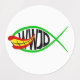 Uma design paródia dos Ichthys (Jesus Fish). O design do peixe Ichthys, amontoado com o Peixe-Coringa de um desenho de quadrinhos. WWJD em texto preto é dentro da pesca, perguntando, "O que o Joker faria?"