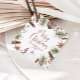 Marcas de favor de Natal neutro rústico com uma borda de Natal em aquarela com pinhas, ornamentos, bastão de doce e bagas de Natal.