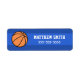 Etiquetas de basquete com basquete em fundo azul. Texto branco. Adicione um nome e uma forma de contato, como um número de telefone ou endereço de e-mail. excelente para rotular seus livros escolares e outros pertences.