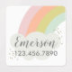 Um adesivo de etiquetas de crianças brancas que apresenta um arco-íris pastel com nuvem branca fluffy e caligrafia Nome e número de telefone da criança abaixo. Adicione isso a uma variedade de itens escolares para facilitar a rotulagem com personalidade e talento. Excelente para duros ou itens macios como caixas de almoço, garrafas de água, bolsas de livros, cobertores, uniformes, camisas, jaquetas, toalhas e outros itens pessoais. Procure acessórios coordenadores e variações de cor adicionais por Stacey Meacham.