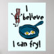 Acredito que posso Fry Bacon poster é para sonhadores e amantes de bacon. A design apresenta uma habilidade azul com dois ovos fritos e uma fatia excitada de bacon pulando para alegria. Acima da habilidade estão as palavras, "Eu acredito que posso fritar!" O pequeno bacon está sonhando em cumprir seu destino crocante. Se ele pudesse cantar, ele certamente estaria cantando, "Eu acredito que posso fritar. Vou fazer gordura que vai pop seu olho. Você sonha comigo todas as noites e dias. Apenas adicione calor e eu vou fritar fora!" Bacon!