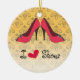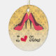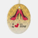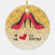 Este Enfeites de natal "I Love Calçados" cerâmico tem um olhar vintage com o fundo damasco e os estilettos vermelhos. É perfeito para a mulher que ama comprar por calçados.