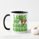 Uma caneca marrom extremamente original de border collie! Uma tiragem de border collie do kawaii está no direito, com imprimir dois-tonificado verde gordo cercando o. O texto lê, "mim ama meu border collie." Mercadoria marrom muito bonito de border collie para amantes do cão. Nós oferecemos este design em uma variedade larga de outros artigos, incluindo camisas. Nós igualmente temos a cor preta & branca do casaco.